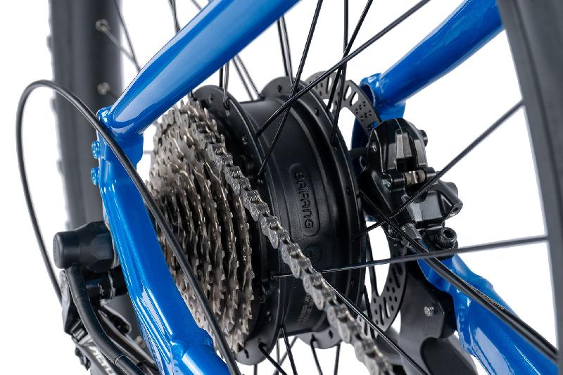Zadní zapletený nábojový motor Bafang s nominálním výkonem 250W a max.výkonem 350W (EU NORMA EPAC EN15194) je vybaven technologií řízení, která se vyznačuje velmi tichým chodem, efektivnějším využitím energie a tím pádem také vyšším dojezdem na jedno nabití.